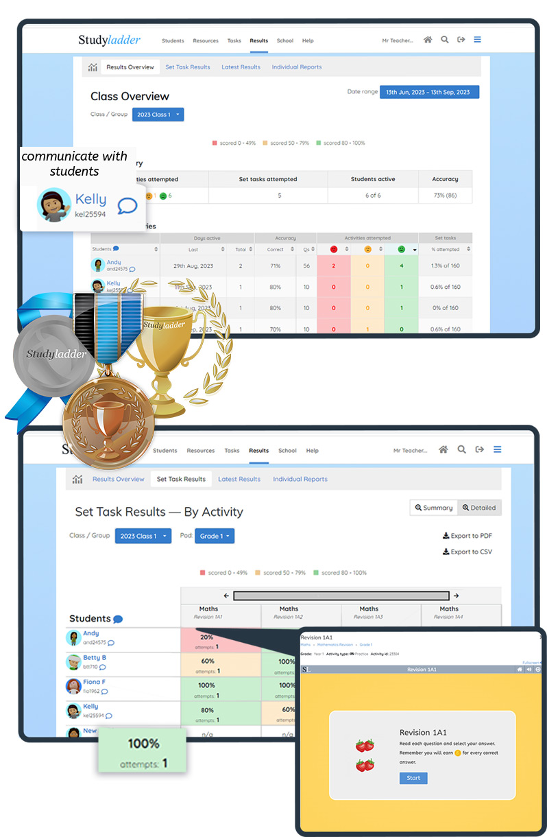 Progress reports and results are accessible via a teacher's account to assist with assessment and reporting. Multiple result formats are available, including class overviews, set task results and individual student reports.