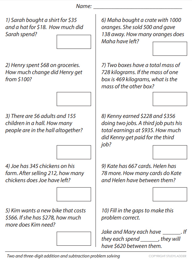Two and three digit addition and subtraction problem solving