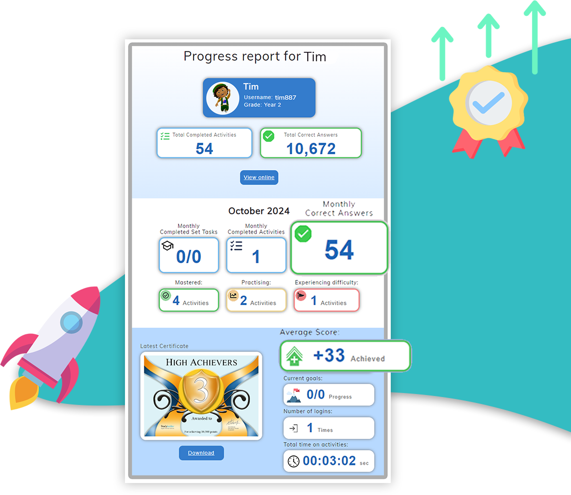 Studyladder’s clear, visual reports make it easy for busy parents to monitor learning, celebrate achievements, and support their child where it’s needed most.